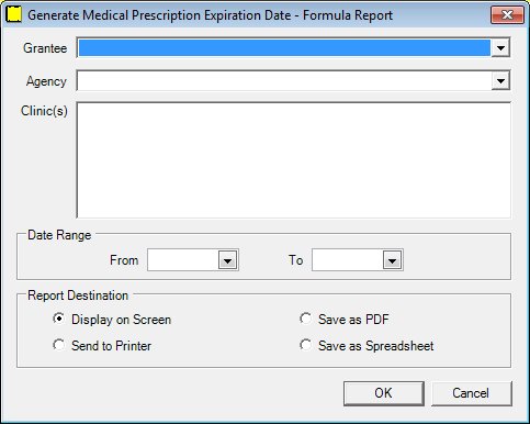 The Generate Medical Prescription Expiration Date - Formula Report screen is used to generate a Medical Prescription Expiration Date - Formula Report CAS006/CLN005/OPR025 (Output) that contains the special formula prescriptions that are expiring within a specified time range.