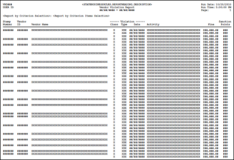 The Vendor Violation Report (Output) displays the vendors that received violations during a specified date range by the selected reporting criterion.